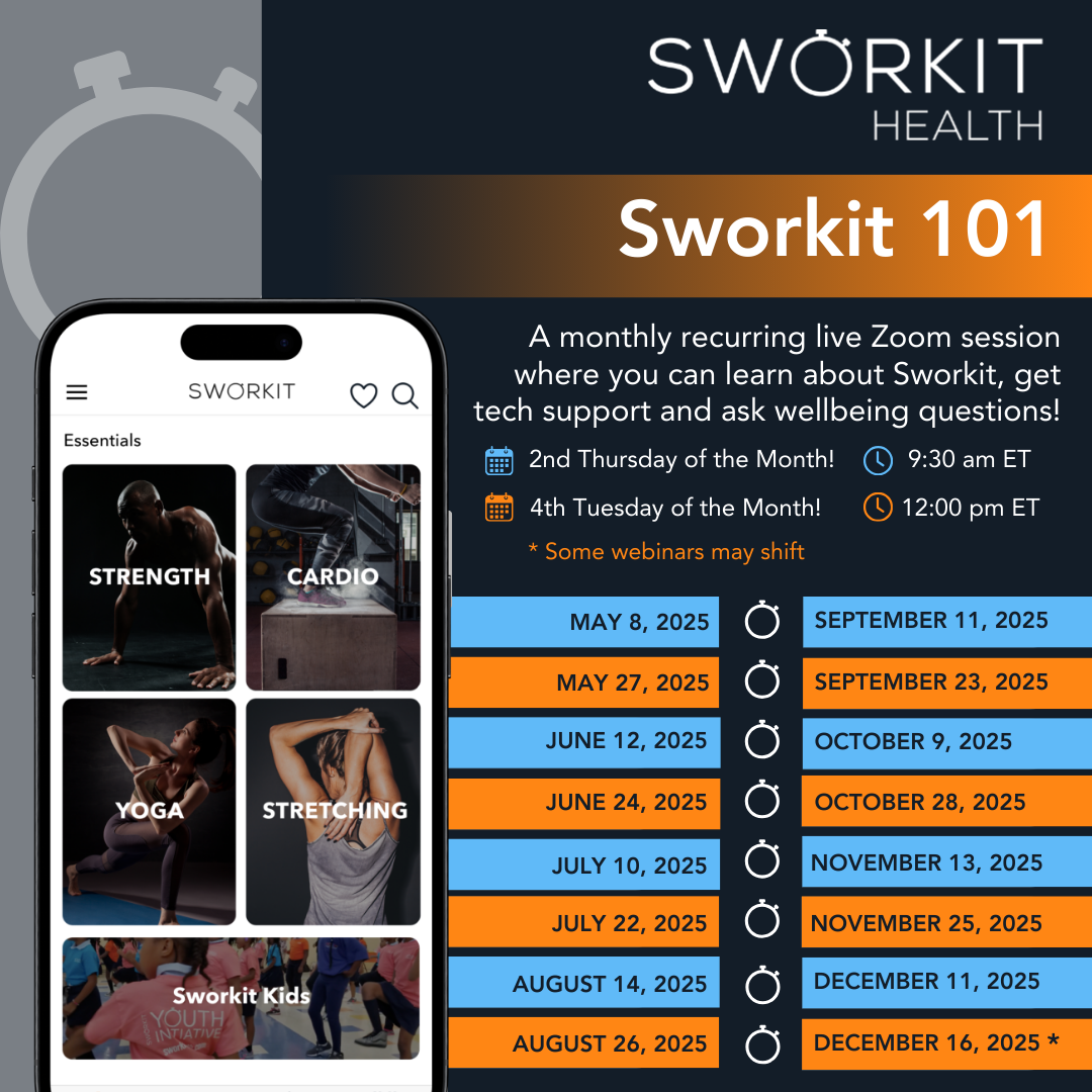 SWORKIT ​101: A monthly recurring live Zoom session where you can learn about Sworkit, get tech support and ask wellbeing questions!